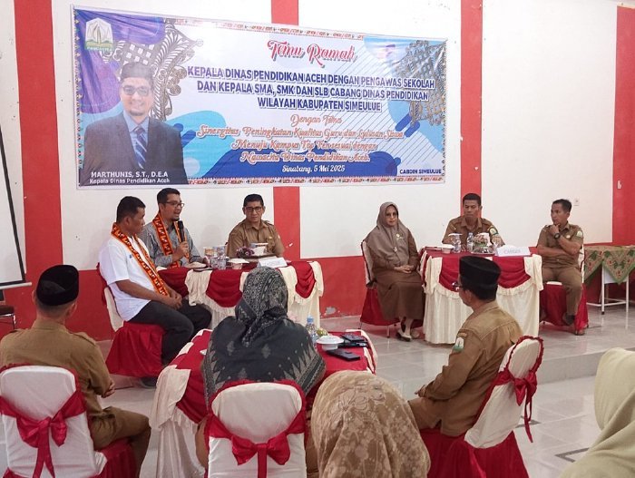Kepala Dinas Pendidikan Aceh, Marthunis, ST., D.E.A, mengadakan pertemuan dengan para pengawas sekolah serta Kepala SMA, SMK, dan SLB di Kabupaten Simeulue. Kegiatan ini bertema “Sinergitas Peningkatan Kualitas Guru dan Lulusan Siswa Menuju Kampus Top Ten” sesuai dengan cita-cita Dinas Pendidikan Aceh. Kegiatan berlangsung pada Senin, 5 Mei 2025, di Kantor Cabang Dinas Pendidikan Simeulue.